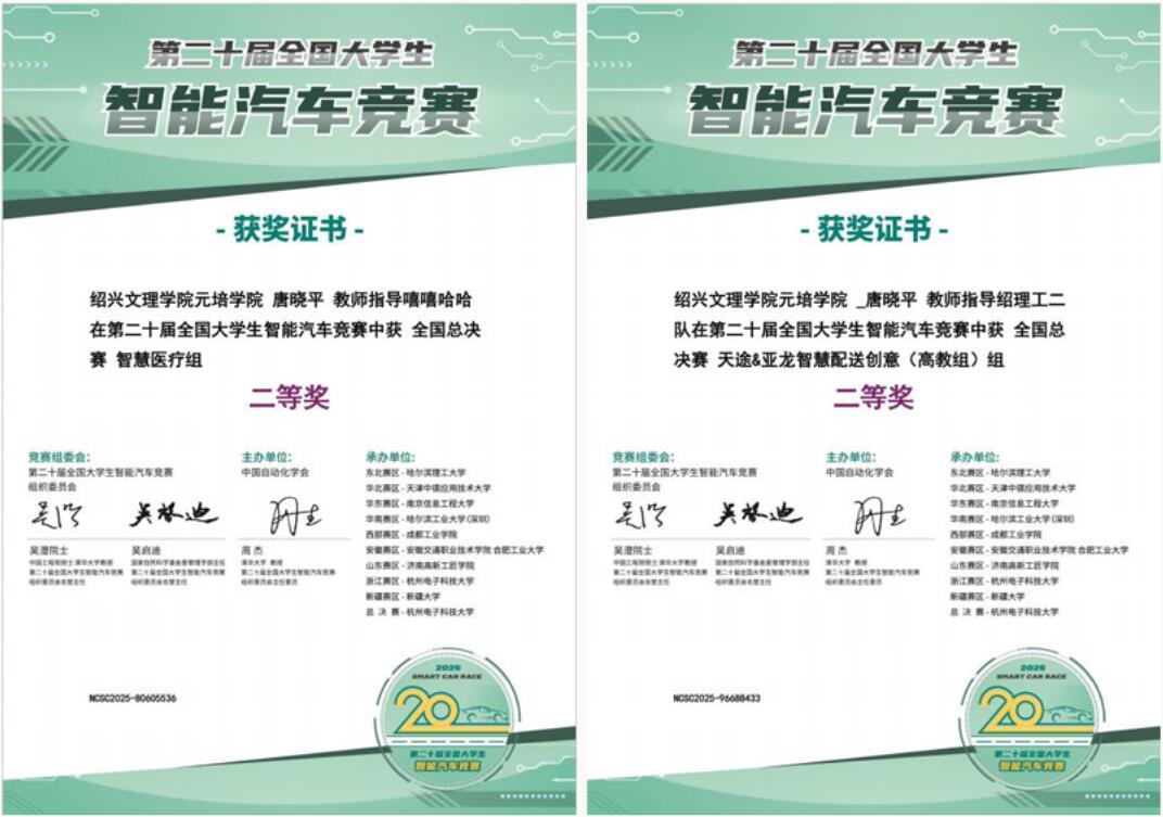 近日,第二十届全国老员工智能汽车竞赛总决赛在杭州电子科技大学落下帷幕。公司信息与机电工程分院派出的两支队伍在决赛中表现突出,荣获全国二等奖2项。