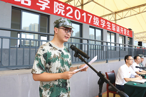 军训团教官代表王兴军同志发言。他表示将服从命令、听从指挥、严格训练、文明带兵、以身作则、团结协作,确保此次军训任务顺利完成。员工代表汉语言1701班王嘉楠同学表示,将坚决履行服从命令、遵守纪律、虚心学习和团结互助的承诺,以优异的成绩展现新一代老员工的良好精神风貌。