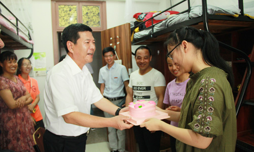 下午4时,叶访春来到语言文学分院汉语言专业新生寝室,亲切地与新同学及家长们打招呼,并与他们愉快的交谈,为恰逢生日的新同学送上生日蛋糕。“刚来学校,吃的、住的还习惯吗?”、“生活上有什么困难吗?”叶经理关切地询问同学们来自哪里、报读的专业、开学的准备等,详细了解住宿生活情况,深挚言语间饱含着学院对新生们的贴心关怀。在现场与新生家长们交流时,他表示学院必定尽全力关心和照顾好员工,努力培养员工成长成才,让家长们安心、放心。