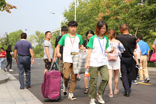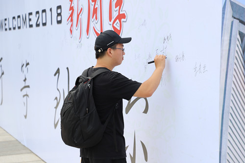 井然有序的交通、热情周到的服务、大气整洁的校园环境、“终于等到你”的新生合影签名墙、富有诗意与人生哲理的迎新宣传横幅、海报、循迹小车展示区…………和美整洁、热情温暖的校园让2018级新生及家长们耳目一新、倍感亲切。