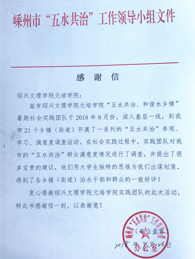 嵊州市“五水共治”工作领导小组寄来感谢信