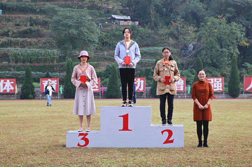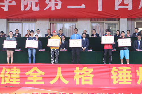 运动员代表(左四)上台领取田径项目总分第一名奖牌