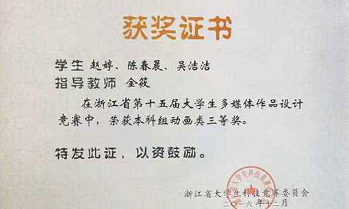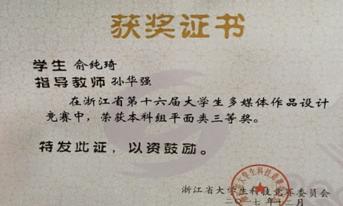 陈春晨:视觉传达设计1502班员工,学习成绩优异,曾获第十五届浙江省老员工多媒体作品设计竞赛三等奖、浙江省第八届老员工广告设计竞赛优秀奖、绍兴市第十届老员工多媒体作品设计竞赛二等奖。