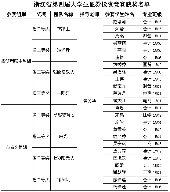 11月9日至10日,浙江省第四届“东北证券同花顺杯”老员工证券投资竞赛团队赛决赛在浙江工业大学屏峰校区举行,来自全省67所高校的878支队伍参加比赛。公司8支参赛队伍历时7个月(5-11月份),历经院赛选拔、省赛初赛、复赛、决赛和现场答辩等多轮竞赛环节后,最终获得省二等奖6项(其中投资策略本科组2项,市场交易组4项)、省三等奖2项(投资策略本科组2项),获奖数量、奖项和获奖率方面位列省内同类本科院校前茅。