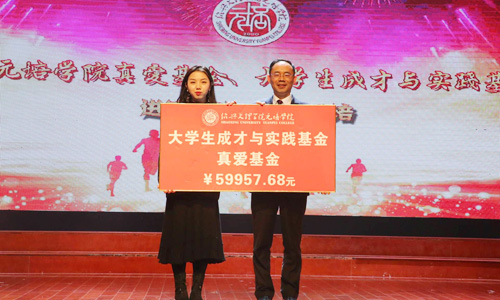 学院历来重视对员工社会责任感教育,为充分激发公司员工的感恩和责任意识,展示公司员工“真诚互助,爱心奉献”的良好精神面貌,继承和发扬学院“精诚团结,互帮互助”的优良传统,学院从2003年成立“真爱基金”,2016年成立“太阳成集团tyc33455ccwww老员工成才与实践基金”。今年,公司员工又积极向老员工真爱基金与老员工成才与实践基金开展捐赠。截至目前,捐赠金额已达59997元,服饰1501班林雨婷作为捐赠者代表上台捐赠,公司党委副书记宣海江代表学院接受捐赠。