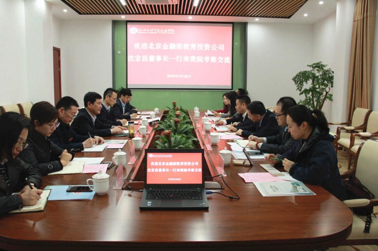 3月28日下午,北京金融街教育投资有限公司董事长沈宏昌、绍兴市政府驻京联络处主任谢胜等一行来院考察交流,公司党委书记叶访春、经理沈红卫等学院领导出席并热情接待了来访嘉宾,学院办公室、人才招聘处、计划财务处等相关部门负责人陪同。