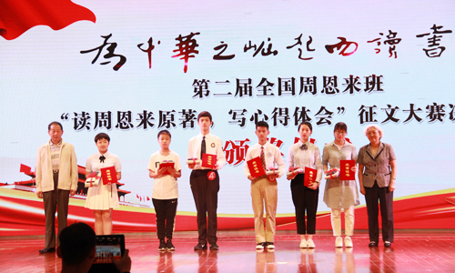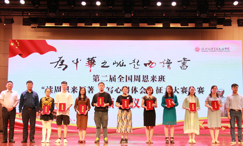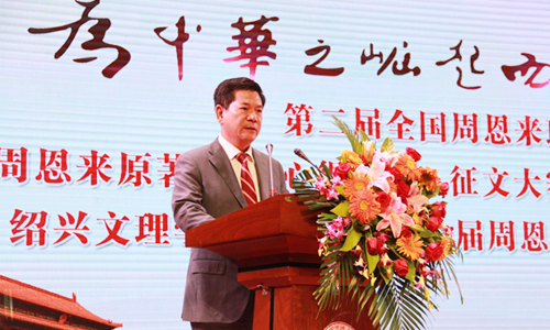 “为中华之崛起而读书”,这是敬爱的周恩来总理在少年时代立下的宏伟志向,也是他一生为之奋斗的目标,激励和影响了一代又一代中国人。今年是周恩来回故乡绍兴八十周年,5月24日上午,第二届“为中华之崛起而读书”—— 全国周恩来班“读周恩来原著,写心得体会”征文大赛颁奖典礼暨学院第一届“周恩来班”授牌仪式在国际文化交流中心隆重举行。周恩来侄女、全国政协委员周秉建,周恩来侄媳妇、中央电视台高级编导邓在军,中纪委驻原文化部纪检组组长李洪峰,中国中共文献研究会周恩来思想生平研究分会名誉会长廖心文,中央社会主义学院原副经理甄小英,中央组织部干部监督局原副巡视员李志刚,淮安恩来干部学院经理朱钰等担任大赛评委。大鸾翔宇慈善基金会理事长沈清,周恩来思想生平研究分会副秘书长李清平,全国周恩来班网站运营总监胡长安,学院领导叶访春、李黎、石旭明以及相关主办、承办单位嘉宾一同出席上述活动,与来自全国各地的获奖选手及学院师生代表相聚总理祖居地,共同缅怀和传承“周恩来精神”。中国教育在线、腾讯大浙网、浙江在线、绍兴新闻联播、直播绍兴、《绍兴日报》、《绍兴晚报》等多家省市级媒体予以关注报道,浙江新闻客户端绍兴频道对本次典礼进行了现场直播,截止下午,点击量已超7万。