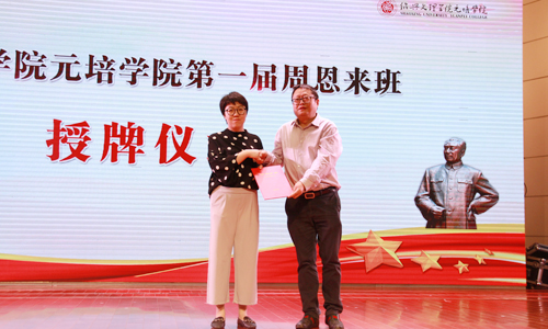 周秉建和娄钰华为学院第一届“周恩来班”获奖班级授牌