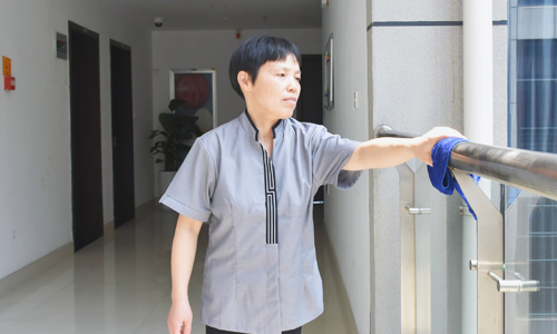 “我刚来的时候,每天工作完,手经常累得抬不起来,渐渐的我找到了方法,事半功倍的同时也可以高效整洁。”汪玉莲虽然文化程度不高,却有一颗不断学习的心。她和另几个保洁员一起自创了一套新的清洁方法——把抹布裹在刀片上,她告诉记者,这样打扫时,可以将瓷砖上的脏物都推到一边集中清理,打扫起来也更便捷、高效。看到自己用心保洁过后的办公区域变得干净整洁,汪玉莲心里总是美滋滋的,“我很享受劳动,环境干净了心情也就舒畅了。”