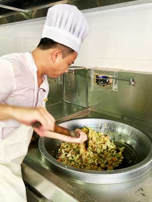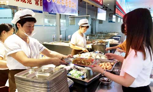 尽管是酷暑,餐厅员工一如既往的从早上5点开始上班,验收菜品物料,整理、清洗、加工、烹饪、装盘,分工合作,各司其职。仓库间,保管员对每一种食品原材料进行一一检查、验收、登记;粗、细加工间,服务员熟练地将蔬菜、鱼、肉等食材分类拣择、清洗、切配;餐具清洗消毒间,保洁员在洗碗机的轰鸣声和闷热的蒸汽中,仔细清洗着每一个餐具;面点间,面点师用力地揉、捏、搓面,拌馅,手工制作着咸淡适宜、精致美味的包子、点心;烹饪间,虽然温度高达40℃,但只要站在灶台前,厨师们就不曾有过一丝马虎,伴随着炙热的油烟,挥动着大勺,不断翻锅颠勺,为师生精心烹饪着各类美味可口的菜肴。