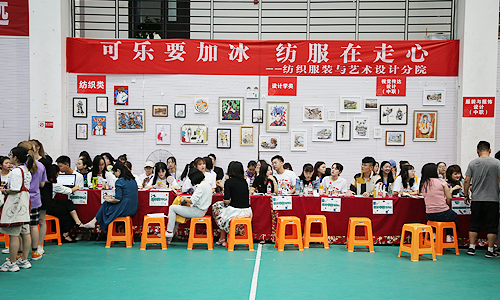 纺织服装与艺术设计分院“可乐要加冰,纺服在走心”的横幅,贴近00后的思想生活,表现了纺服不仅在迎接新生时教师与员工的“走心”,并且将“走心”融入到课堂和教育中去。今年纺服分院报到处不仅展示了来自学长学姐的优秀作品展览,还开展了新生对绍兴、学院和对老员工活憧憬的绘画作品征集活动,并将新生们的作品也做了一一展览。