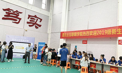 “腾讯云互联网学院热烈欢迎2019级新生”,信息与机电工程分院利用腾讯互联网学院专业优势,设置主题拍照展板,新生们站在展板后面,在展板的头像留白处拍照留念,期待老员工活新的开始。