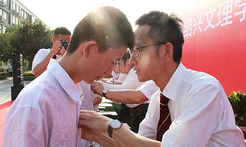 在开学典礼上,学院领导为新生代表佩戴院徽。作为学院的标识和文化魅力展示的名片,正式戴上院徽这份特别的“入学礼物”,也标志着新生们拥有一个新的共同的身份——元培人,更意味着新生们将担负起元培学子的使命和责任。