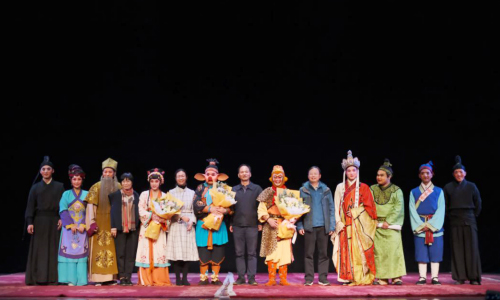 员工代表上台为主要演员献花,受邀嘉宾、领导上台与全体演员合影
