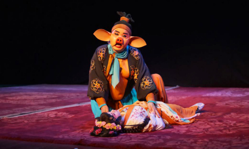 演出在忽明忽暗的柔美灯光下拉开帷幕。绍剧《灿烂八戒》主要讲述了八戒因在天庭调戏嫦娥被贬下凡,错投猪胎,幻化为人后,在高老庄与高翠兰的一段动人而有趣的戏曲爱情故事。开场,“八戒”发现自己投身为猪的错愕和惊慌失措,后被工作人员拿起喷雾变身的这一段表演的妙趣横生,场中笑声此起彼伏。随着剧情的发展,“高翠兰”面对心仪之人的羞涩、因天不遂人愿被迫分别的难过,“八戒”凡间经历的乐趣、跪地发誓的决心……一幕幕场景吸引着在场师生,曲尽其妙,动人心弦。《灿烂八戒》以超脱往常的套路,百变的语言风格、创新的演绎方式,催生出与现代社会相协调曲目,彻底颠覆了现代青年对传统戏剧的看法,有趣的剧情、幽默的言语、精湛的演绎、华美的戏服,为在场师生带来了一场全新的视听享受,在乐趣中感受绍剧文化的艺术精髓。