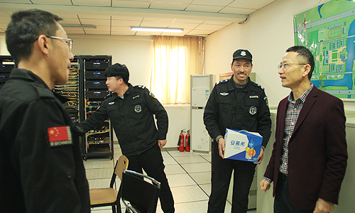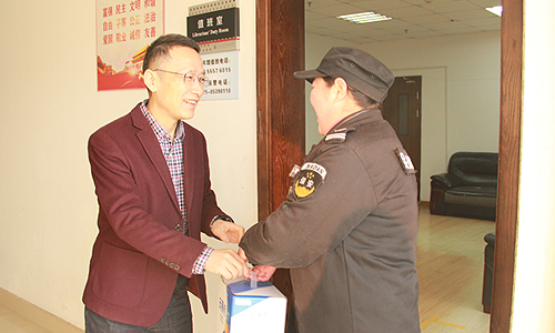 沈红卫一行先后来到图书馆一楼门卫室、西大门门岗及派出所警务室、南区高配房、员工公寓值班室、老员工活动中心监控室等,亲切慰问了寒假期间依然坚守岗位的教职工,致以诚挚的问候并代表公司党委和行政送上了新春祝福和慰问品。