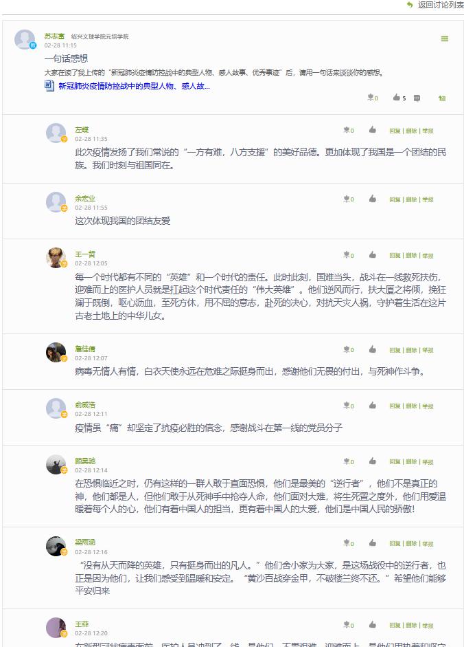 “结合疫情当下,人生未来,谈谈你的责任和担当是什么?”“在读了新冠肺炎疫情战斗中的典型人物、感人故事、优秀事迹之后,用一句话谈谈你的感受。”“结合自身经历谈谈,疫情当下,你的心理有过怎样的波动,你是如何调整的?”这是马克思主义分院的老师们利用网课平台和员工们实时交流互动的问题之一瞥。恰切的问题设置、亲切的话语表述,直击员工内心,让广大的同学有话可说,有话想说。