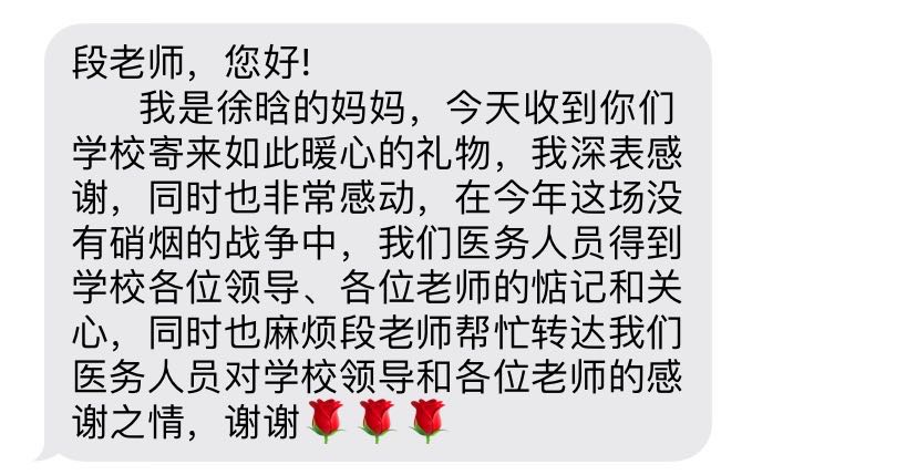 一位抗疫一线学院员工家长收到慰问礼品后对学院表示感谢