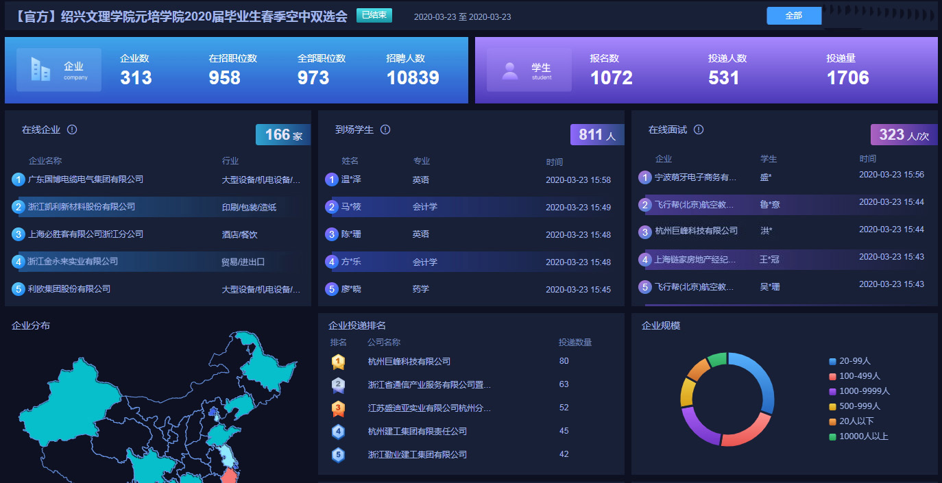 为切实保障毕业生身体健康和就业权益,最大限度减轻疫情对毕业生就业工作的影响,3月23日,学院联合“智联招聘”举办了2020届毕业生春季空中双选会。本次双选会共有310余家单位报名参会,提供就业职位近1000个,岗位累计超10000个,共有1072名校内外员工参与应聘,共投递简历1700余份。参加当天招聘会的,不少是上市公司以及上规模的国有企业、合资公司、外资企业等,涉及教育培训、医药生物、经济贸易、建筑工程、IT技术和设计制造类等多个行业领域。
