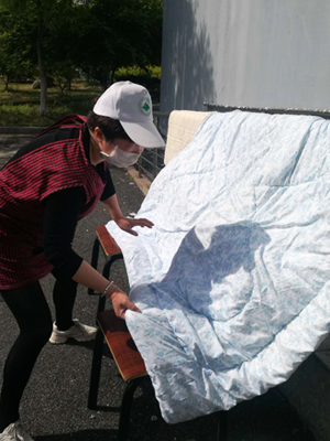一清早,阿姨们就陆续接到了“订单”,开始了格外忙碌的一天。首先对寝室进行仔细消毒打扫、开窗通风,对寝室里的花花草草进行浇水除杂,一楼到六楼,每个楼道里都留下了阿姨们忙碌奔波的身影。天气晴好,在进行晾晒工作时,为了确保不出错误,阿姨们仔细核对宿舍床位,细心地在被子上用回形针挂好每一位同学的编号。放眼望去,寝室楼的天台上、楼宇间的空隙地,同学们心心念念的被褥都已经在愉快地晒着“日光浴”啦!聊天群里,当身处五湖四海的同学们,通过手机朋友圈看到宿管阿姨的暖心操作后,隔空开启了一波比心表白。待日落时,阿姨再帮同学们收回被褥,整整齐齐地铺好。来自汉语言专业的员工侯晓璐激动地说:“为了让同学们返校后能有舒适的住宿环境,学院真是太贴心了,考虑这么周到,为我们解决了后顾之忧。!”