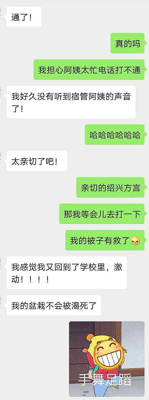 “叮咚,宿管阿姨喊你晒被子啦!”4月15日一大早,一则《寝室温馨服务提示》的通知让同学们欣喜不已。受疫情影响,全国各地的元培学子无法按时返校,接连的阴雨天气更是让员工们忧心寝室的被子是否过潮,绿色植物是否枯萎,衣柜是否做了碗“菌菇汤”?