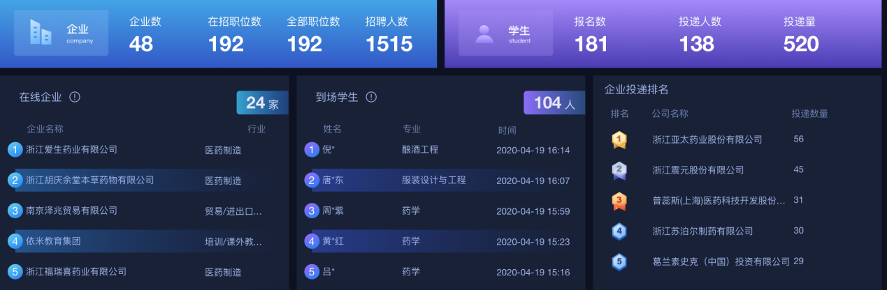 本次“空中双选”招聘会汇集了辉瑞制药、雅培制药、江苏恒瑞、浙江震元等近50家国内外知名医药类企业报名参会,提供医药QC/QA、OTC市场部助理、药物制剂研究员等类别的职位192个,就业岗位数总计超1500个,共有181位校内外员工参与应聘,共投递简历520份,其中医药与健康分院156毕业生全员参与本次双选会。
