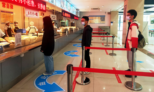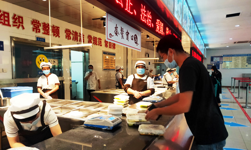 为做好员工复学后的后勤保障工作,餐饮服务推陈出新,食堂就餐推出暖心点餐和送餐服务,鼓励每个寝室派一名员工代表到食堂购买套餐回宿舍用餐,即取即走,堂食用餐实行一桌两人呈对角线落座用餐,排队区域设置一米地标线、指示牌等,并实行人流管控;超市上琳琅满目的商品,便捷的网上商品预定服务,解除员工的后顾之忧;物流中心,安全上线,为员工提供及时、高效的校内快递服务。