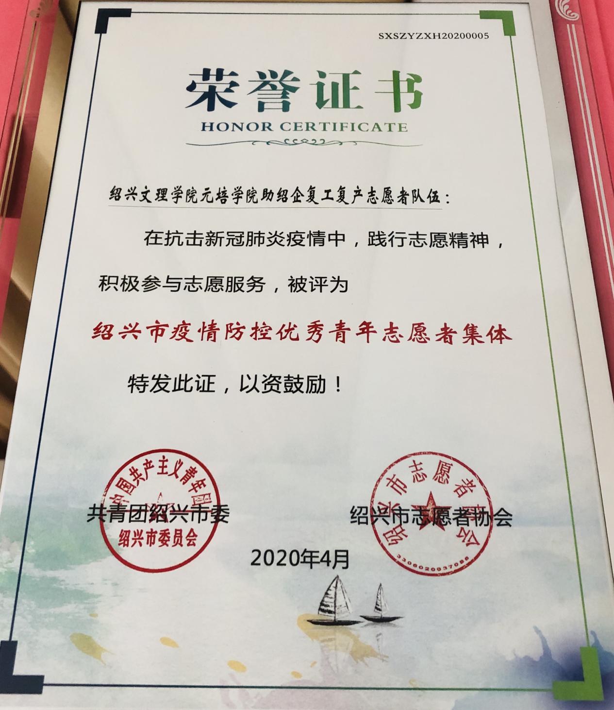 新冠肺炎疫情发生以来,绍兴市广大志愿者及志愿服务集体积极响应党和国家号召,不惧风险、无私奉献,主动投身防疫一线,广泛开展志愿服务活动,充分发扬志愿服务精神,涌现出了一批担当作为、表现突出的先进典型。为树立典型、表彰先进,绍兴市委、市志愿协会特对47名优秀青年志愿者、20个优秀青年志愿集体予以通报表扬。公司“助绍企复工复产志愿者队伍”荣获绍兴市疫情防控优秀青年志愿者集体称号。