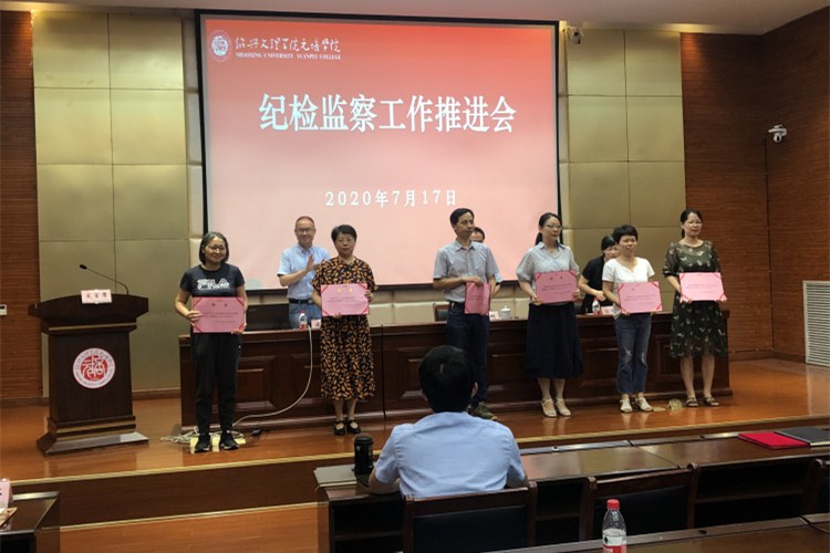 会议举行了学院第一届纪检监察员、特邀监察员的聘任仪式。纪委办负责人就相关工作文件进行了解读,校纪检监察室副主任凌坚就如何开展二级纪检监察工作进行了经验交流。会议还对获得2019年度“廉洁四季风”活动“优秀组织奖”的语言文学分院、经济管理分院和纺织服装与艺术设计分院等单位进行了表彰。