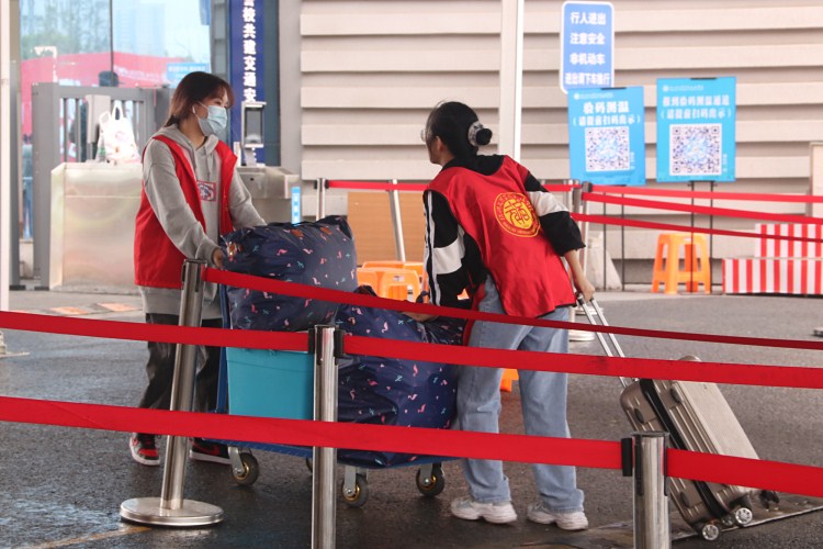“我的小孩是有住宿经历的,但这还是第一次小孩离开家乡到外地读书,我还挺担心这么多东西她一个人搬不进去。这次过来,看到学校里有穿着红马甲的也有穿着军装的志愿者们一起来帮忙,我们也就放心了。”设计类2001班陈曼丽的家长章小菊在校门外对记者说。