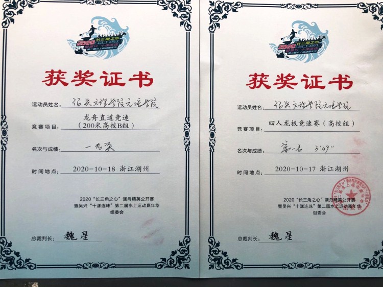 10月17日至18日,由湖州市体育局和湖州市吴兴区人民政府承办,国家体育局水上运动管理中心指导,浙江大学和湖州人民政府共同主办的“长三角之心”漾舟精英公开赛暨吴兴“十漾连珠”第二届水上运动嘉年华胜利落下帷幕。公司龙舟队与浙江大学、复旦大学等十二所高校代表队同台竞技,分别以1分01秒和3分49秒的优异成绩勇夺名校组200米直道、四人龙板竞速赛两项团体冠军。队员宋林航与罗家豪两位同学分获皮划艇耐力冲城赛单人第四、第五名的佳绩。