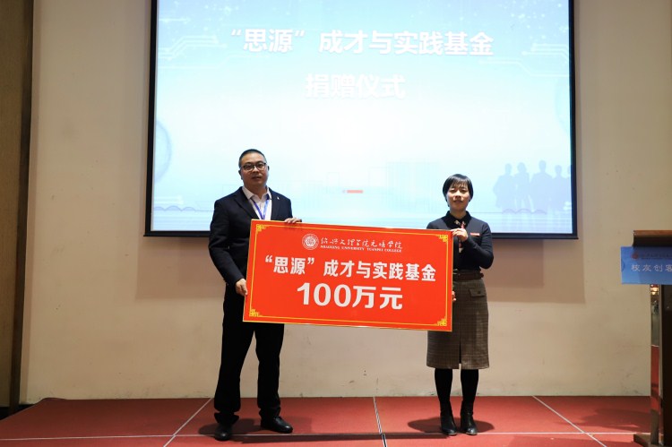 公司“思源”老员工成才与实践基金捐赠仪式举行,云联盟第一届理事会会长潘自成(图左)代表云联盟向学院捐赠100万元“思源”成才与实践基金,学院纪委书记俞国芬(图右)接牌