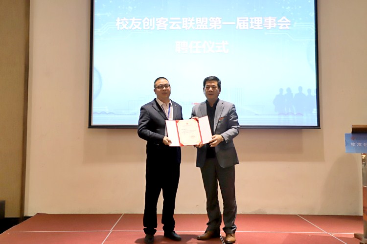 公司纪委书记俞国芬(右一)和云联盟第一届理事会会长潘自成(左一)为联盟顾问团成员颁发聘书