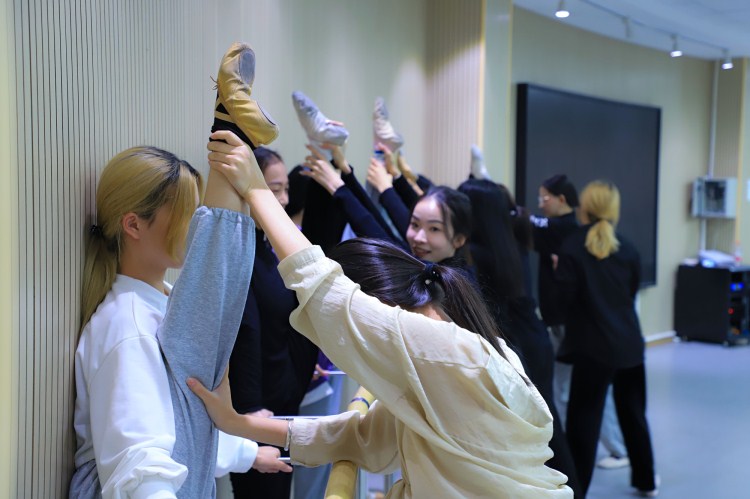 团长胡诗佳回忆起的第一支舞是《沁园春雪》,当时舞蹈团还没有排练厅,她们每天晚上只能在一号教学楼的大教室排练。自己找空地,没有镜子,就晚上开着灯对着窗户的反光练舞。冬天没有空调,跳舞把身子跳热了,脸还是冻得红扑扑的。这样的日子,她们坚持了整整一个学期,每天晚上六点开始跳舞,十点结束,一个晚上连排两三支舞,承包了学校各大晚会的舞蹈表演。“搬到这里特别开心,有空调,有瑜伽垫,有镜子,还给铺了地胶。”纺织工程1801班的钟紫欣感叹。她今年大三,加入舞蹈团也是第三个年头了。时至今日,舞房仍然是她们每天的打卡点,周三的舞蹈课,周四的集训课上总有她们的身影。“每届都是这样的,每节课都要来,这是一种责任。”胡诗佳表示。“大家一起跳舞是一种享受,一起练习基本功,一起编舞,一起排练,我们并不觉得辛苦。”