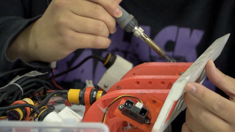 2019年11月,陈庚带着他的小车出发了!这次是“快递机器人”,主要是搬运物料,结构比较复杂。赛前,他不断在学校测试练习,“虽然会提前准备地图进行测试,但是与比赛现场相比还是存在很多不确定因素,比如,传感器是通过颜色折射率来看,不同环境折射率存在差异,即便是在学校调整好的代码,折射率也极有可能反应不出来。”为了提高精确度,陈庚和他的同伴天天泡在实验室,刚修改完数据,就抱着小车准备上四楼的调试实验室测试小车。小车开始缓缓走动,跑直线、抓取物料、识别扫码,再到避障、循迹、过山河、过桥梁,送到最终的地点,再按照物料最终的形状摆放……一趟下来,陈庚发现小车还是存在许多的问题,于是他匆匆忙忙抱起小车往二楼实验室赶,二楼是“修车”的地方,他需要对小车硬件、软件等方面再不断的进行调试。