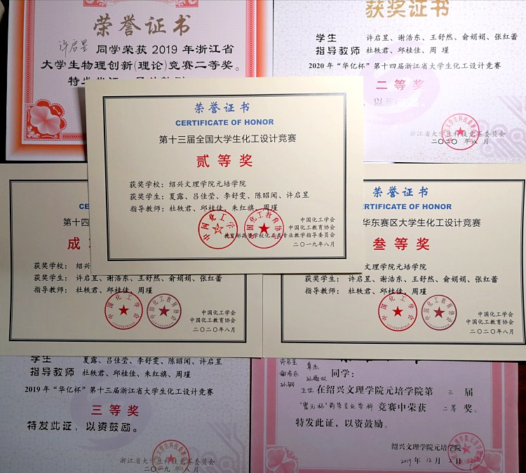 一次偶然的机会,许启昱了解到了学科竞赛,他找到了一条自己想走的路。第二年参赛,在老师的支持下,他作为队长,带领队员们参加了全国老员工化工设计竞赛。由于专业并不对口,他带的五人队里,四个都没有相关经验,虽然压力非常大,但率先扛起责任早已成为他的习惯。他带着组员们从了解竞赛步骤开始,一步一步进行相关知识的学习积累,大家一有课余时间,就聚在教室里做题、讨论。二月中旬得题,经过文献的查找、分析、比选,再进行包括论文、化工设计流程模拟、CAD制图等,对化工设计内容进行绘制、撰写、整理,一次又一次修改。