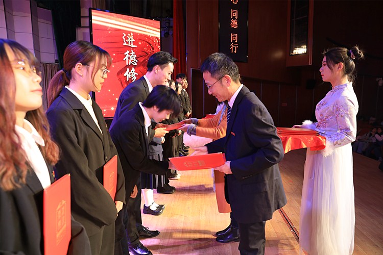 在学院第三届蔡元培奖学金颁奖典礼上,蔡元培奖学金获得者语言文学分院董梦莹同学、经济管理分院李佳汶同学、纺织服装与艺术设计分院蒋丽同学、信息与机电工程分院齐林同学、医药与健康分院黄慧强同学、“星星之火”团队上台,学院经理沈红卫、绍兴市教育局高教处处长赵佳维共同为获奖者颁奖。近日,学院举办第三届“蔡元培”奖学金评选活动,全院师生广泛关注,活动历经1个多月,从海选、网投到现场展评每一个环节都得到了学院领导、老师和同学们的积极关注和大力支持,最终评选产生5个个人和1个团体。奖学金的评选在元培学子中践行了“进德修业”的院训,传播了“五育并举、兼容并包”的教育理念,以校园榜样的典型事迹感召、激励同学们为梦想而不断追求,用自己的实际行动展示元培学子昂扬的精神风貌,成为自觉成才的巨大精神动力。