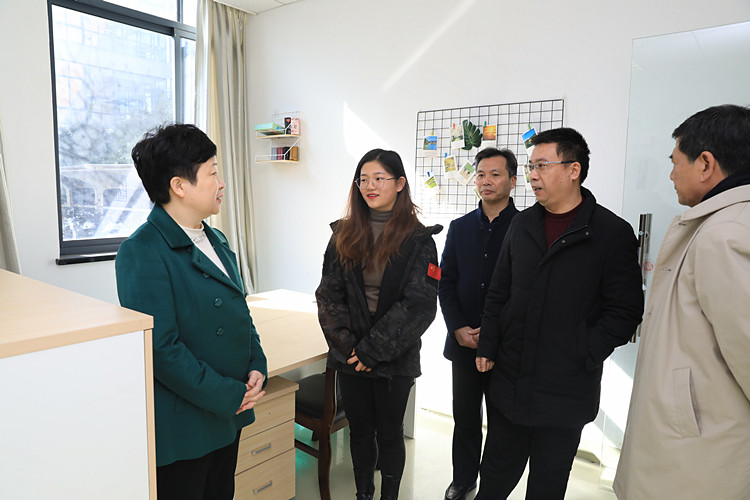 在创新创业学院,王琴英与参与创业的老员工亲切交谈,询问了解所学专业和项目经营情况,详细了解老员工创业有关情况。