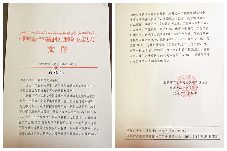 “首先,代表中共伊宁市伊犁河路街道社区卫生服务中心支部委员会向贵校表示真心的感谢和敬意......”日前,公司语言文学分院收到了一封“远道而来”的表扬信。该信对汉语言文学1802班张宸同学疫情期间参与当地卫生服务中心核酸检测志愿服务工作给予了表扬。