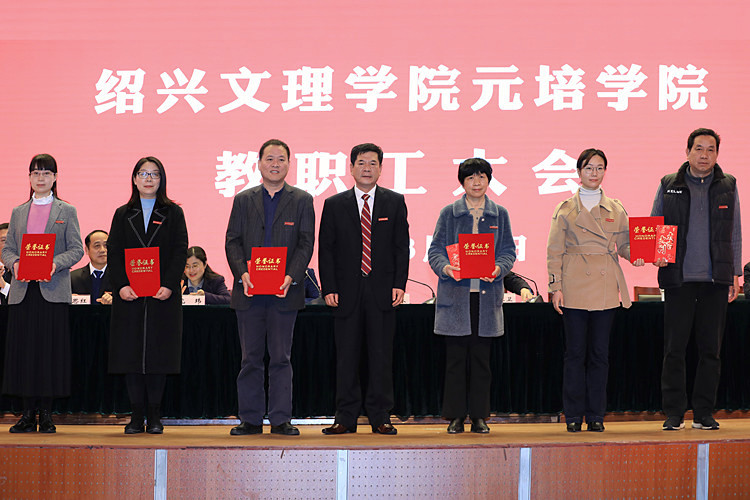 大会表彰学院教师荣誉最高奖“元培教师奖”获得者,公司党委书记叶访春为获奖教师陶丹丹(左一)、劳越明(左二)、潘慧(左三)、周瑾(右三)和获奖团队学院公共艺术与体育教育团队代表俞路(右二)、余丁友(右一)颁奖。
