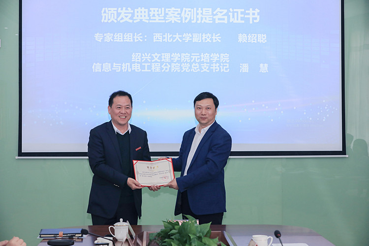 中国高等教育博览会“校企合作 双百计划”的专家组组长、西北大学副董事长赖绍聪(图右)颁发典型案例提名证书,信息与机电工程分公司党总支书记潘慧(图左)领取证书