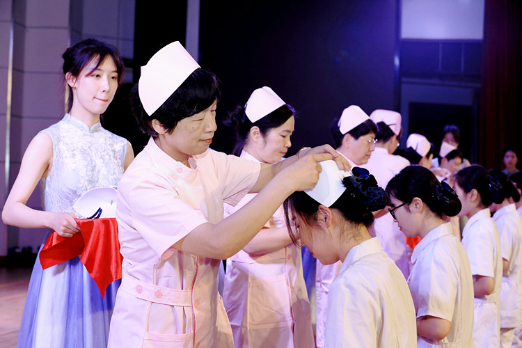 仪式上,参赛代表队从仪容、仪表、站姿、坐姿以及拾取物、端治疗盘、持病历夹、推治疗车等不同方面,对护士礼仪风采进行精彩展示。叶访春为8位获评最美护生的考研成功者、就业先进者、优秀党员和员工干部颁奖。在授帽环节,伴随着悠缓的乐曲,台上护理前辈们带着殷殷嘱托,依次为同学们授帽;台下分院相关教师为2018级护理专业员工点灯,烛光与灯光交相辉映,场面庄重而神圣。一顶燕帽,不仅联结起浓浓的师生情,更传递出努力与坚持,寄托着对白衣天使们未来的期许与希望。戴上燕帽,全体同学在优秀员工、浙江省先进护士金婷婷的带领下庄严宣誓,并认真聆听她的学习工作经验和体悟。