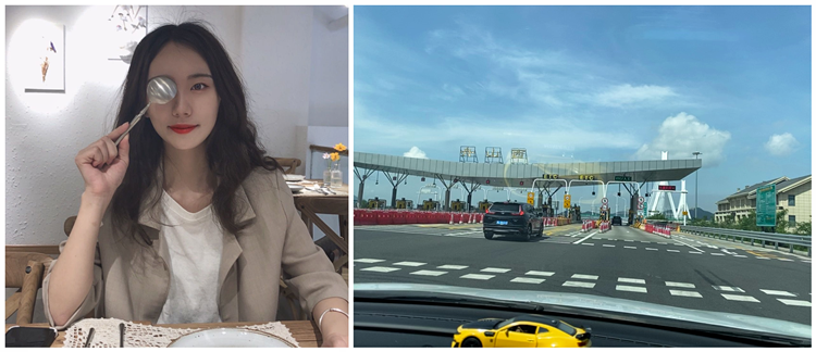 左:杨静妮个人照 右:杨静妮自驾车驶离舟山