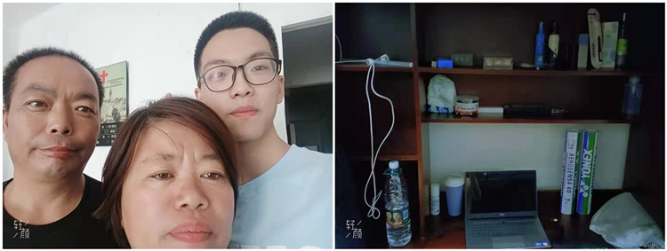 左:叶周典与家人合照 右:叶周典整理好的寝室书桌