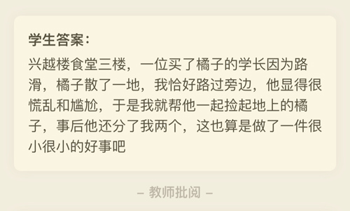 据悉,除了线上学习20个课时之外,新生还要完成一个特殊的作业,要以图文或vlog的形式记录入校后一周内的生活。每日打卡,寻善源、存善心、发善言、行善事。同学们通过中华经典诵读、名著赏析等从优秀传统文化中寻找善念;亦或常怀爱心、富有同情心、拥有感恩之心,寻找校园里的好人好事;又或者是每天做一件好事,自觉为他人、班级、学院和社会做一些力所能及的事。活动持续了一周,始业教育的网上学习平台已收到10000多条反馈,整体效果喜人。