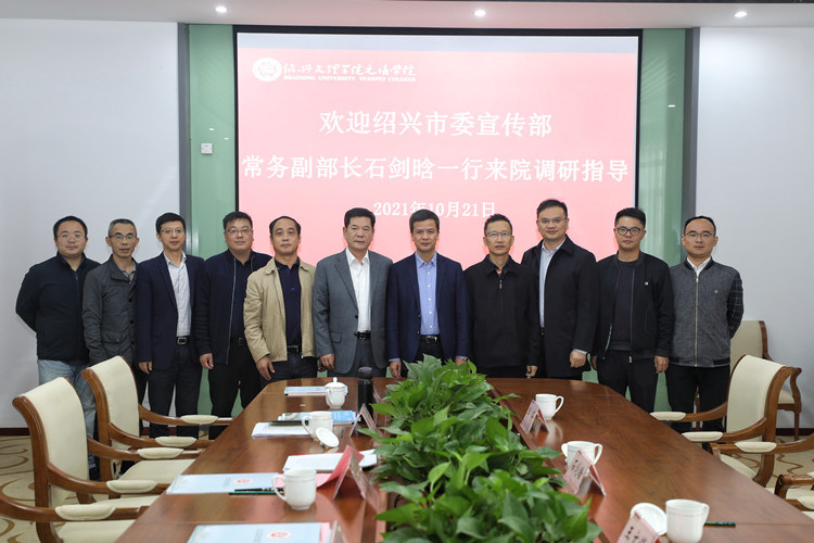 10月21日上午,绍兴市委宣传部常务副部长石剑晗一行来院调研指导,公司党委书记叶访春,经理沈红卫,副经理周思红,党委委员、党委、经理办公室主任王学炎出席交流座谈。学院教师、绍兴市文化产业促进会副会长兼副秘书长、绍兴市文化产业研究院经理应锋,学院教师、绍兴市文化产业促进会办公室主任张烨,科研与对外合作处负责人等参加座谈会。