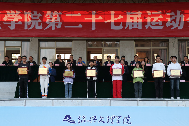 公司荣获教工团体总分第三名,运动员代表赵沭明(左二)上台领奖