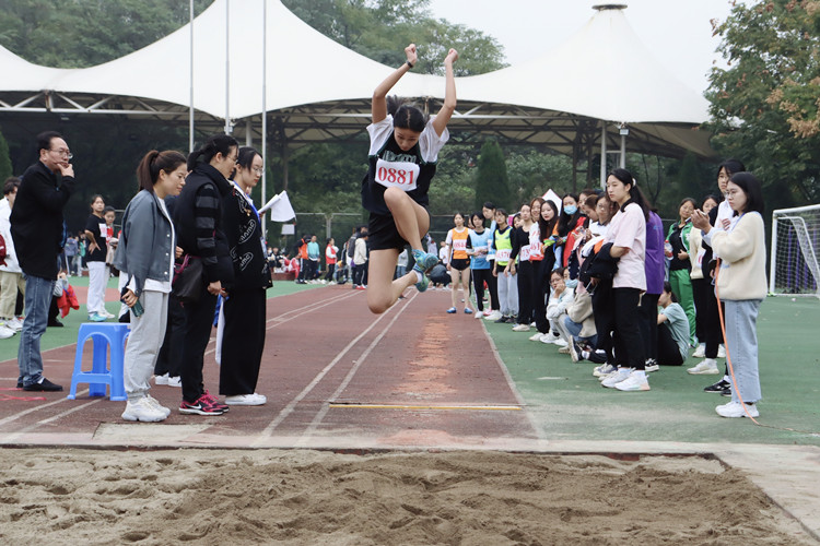 无独有偶。在田赛竞技场,也有老将取得新的突破和进步,摆臂、下蹲、起跳、腾空,牛雅婷以4.31米的成绩斩获了女子跳远冠军。去年作为“新鲜血液”初入赛场的她,拿到第三名的好成绩,但牛雅婷对此并不满意。一年的备战期,牛雅婷先是凭借4.13米的成绩拿到院运会女子跳远的冠军,通过积极备战,以赛代练,后又以院运会女子跳远4.31米的优异成绩强势出线,为元培代表队再添一金。从第三名到第一名,虽然只是领奖台的咫尺之间,但牛雅婷却为此付出了不小的努力,她不满足于现状,目光早已投射到了省运动会的舞台。