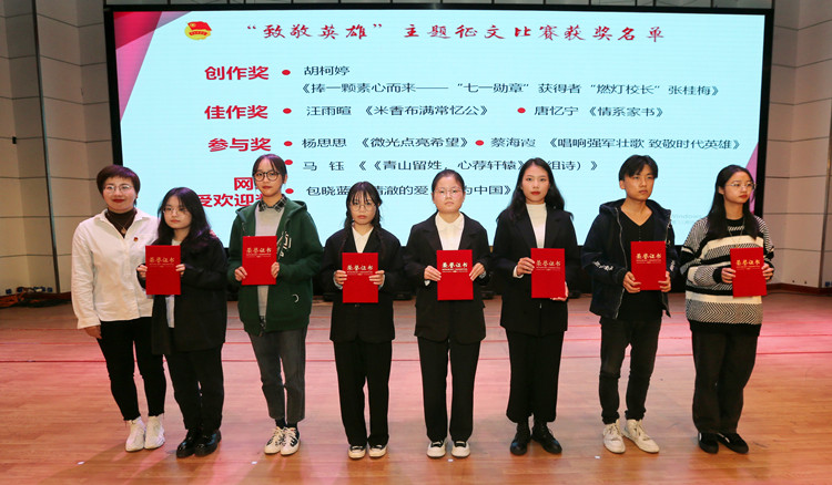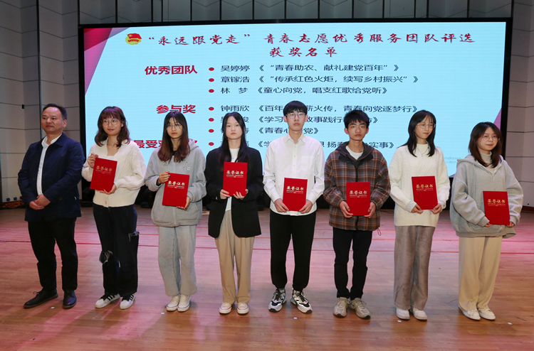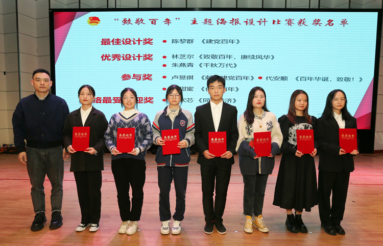 大会分别颁发了“致敬英雄”主题征文比赛、“致敬百年”主题海报设计比赛、“寻找红色记忆”主题短视频比赛、“永远跟党走”青春志愿优秀服务团队以及优秀组织奖等个人和集体荣誉。石旭明为“永远跟党走”青春志愿优秀服务团队浙江越秀外国语学院国际商学院工三红船队《青春助农、献礼建党百年》、国际商学院学子《传承红色火炬,续写乡村振兴》、共产主义接班人队《童心向党,唱支红歌给党听》、中文学院温州红色党史教育实践团《学党史 悟思想 扬奉献 办实事》,浙江工业职业技术学院设计与艺术分院青年志愿者协会《百年奋斗薪火传,青春向党逐梦行》、机电工程学院团委《“新青年·下乡”暑期社会实践成果集》,浙江农业商贸职业学院“永远跟党走”志愿服务队《青春心向党》颁奖;徐悦来为优秀组织奖获奖单位浙江越秀外国语学院团委、太阳成集团tyc33455ccwww团委、太阳成集团tyc33455ccwww团委、浙江工业职业技术学院团委颁奖;邵小刚为“寻找红色记忆”主题短视频比赛获奖者孙跃跃、董薇怡、滕哲圆、练余标、吴玲俊、张雨柯、陈雳颁奖;屠瑾为“致敬英雄”主题征文比赛获奖者胡柯婷、汪雨暄、唐忆宁、杨思思、蔡海霞、马钰颁奖;舒文为“致敬百年”主题海报设计比赛获奖者陈黎群、林芝尔、朱燕青、卢昱祺、代安顺、余甜蜜、郑欢芯颁奖。