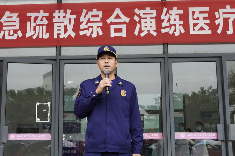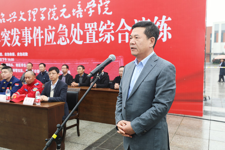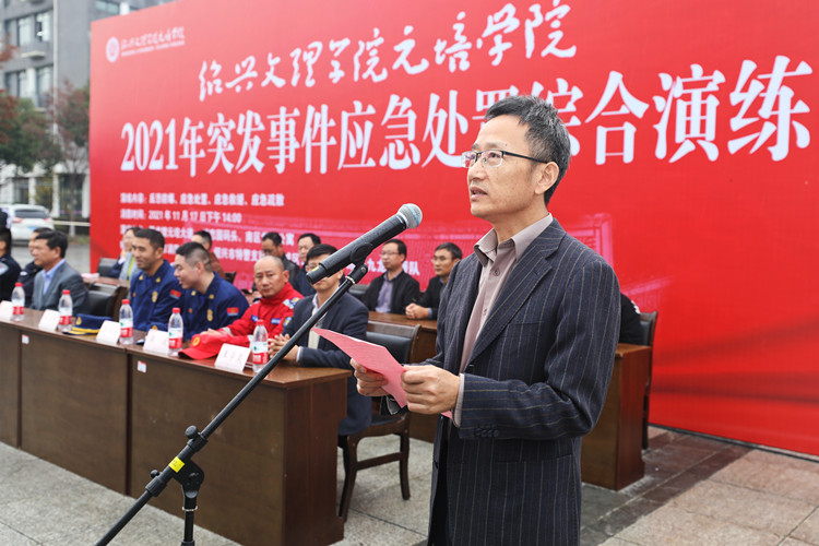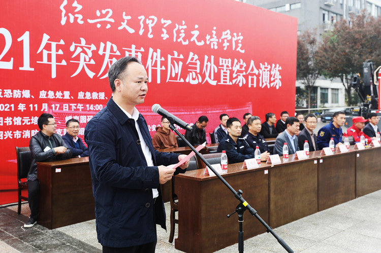 沈红卫代表学院向市消防救援支队、市特警支队、越城区公安分局、绍兴九龙救援队的领导和队员的到来表示衷心的感谢。他指出,多年来,学院切实把安全工作放在首位,不断强化师生安全教育,有效保障全院师生的生命安全,维护校园的安全与稳定。他希望在校员工能够提高安全防范意识和自救自护的能力,掌握在危急情况下机智逃生的本领,积极做好安全宣传工作;全体师生能以这次突发事件应急处置综合演练为契机,进一步把学院的安全工作做实,为继续推进平安校园、和谐校园不懈努力。